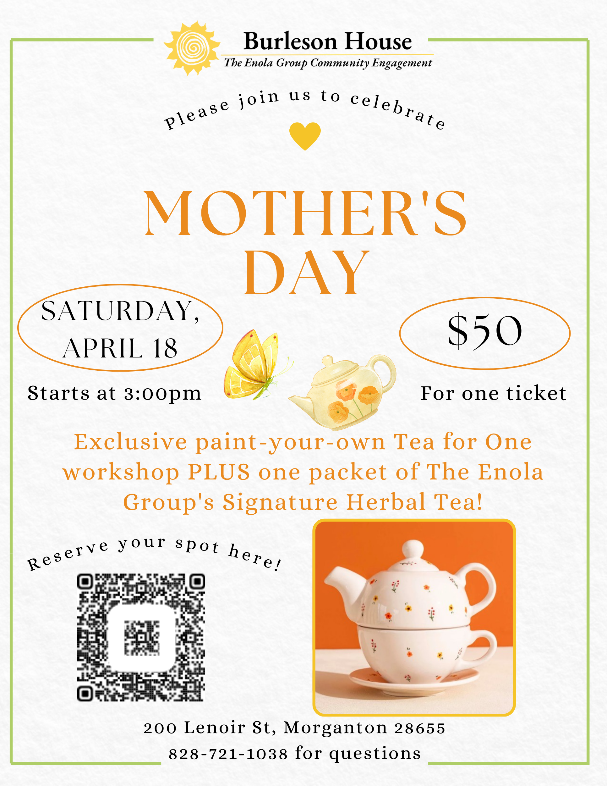 Bonus!! We are including a pack of The Enola Group’s signature herbal tea bags. If you haven’t heard yet, these tea bags are thoughtfully crafted by our signature day program from the most fragrant herbs harvested right here at the Burleson House! 🌷We only have a limited quantity of these available so sign up today to reserve your spot!